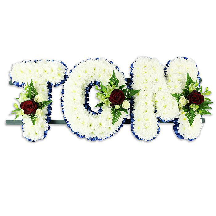 Designed to convey your deepest sympathy, the TOM letter tribute offers a dignified and personal way to say goodbye. Each bloom is carefully selected for freshness and quality, ensuring your arrangement looks stunning throughout the service. Approximate dimensions are 90cm (35") in length, 33cm (13") in width and 20cm (8") in height, making it a striking display for the funeral or memorial venue.