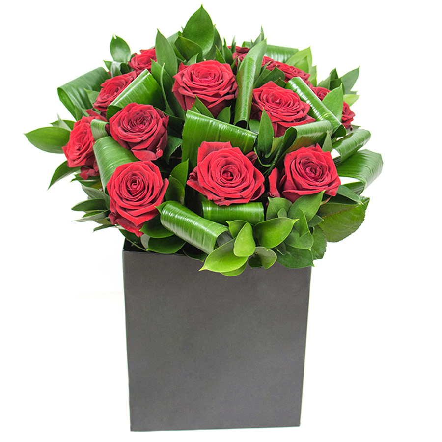 Illuminate your home with our breathtaking bouquet featuring radiant red roses, vibrant aspidistra leaves, and sophisticated ruscus. This unique arrangement is designed to add a touch of luxury and charm to any room.