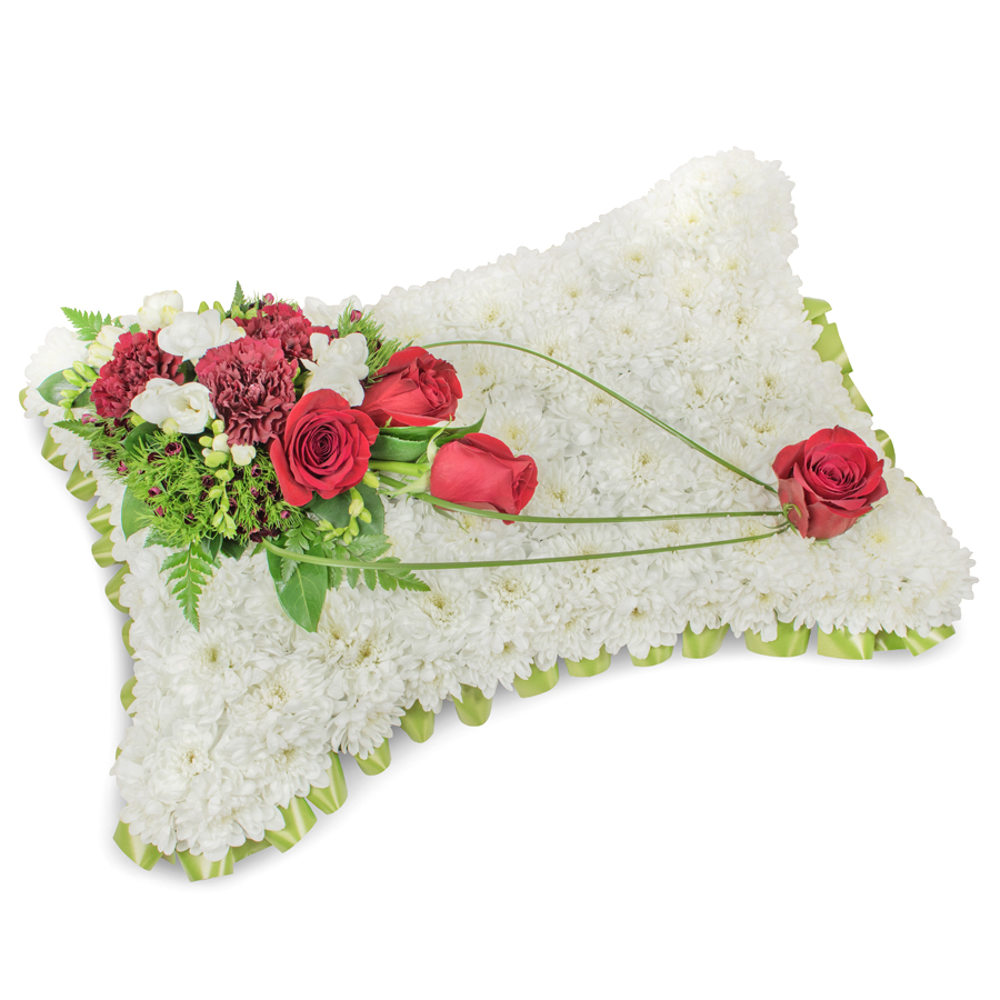 Express your deepest condolences with our Sincerest Sentiments Cushion, a graceful funeral tribute hand-crafted by expert florists at Flower Delivery Friern Barnet. This elegant cushion arrangement combines pure white chrysanthemums with rich red roses, dark red carnations, soft white freesias, dianthus and bear grass for a beautifully balanced display of respect and remembrance. Designed to convey heartfelt sympathy, its classic red and white colour palette suits funerals, memorials and sympathy deliveries to homes or funeral directors in Friern Barnet and nearby areas. Approximate dimensions are 45cm (18") in length, 60cm (24") in width and 12cm (5") in height, creating an impactful yet refined floral tribute. Roses are delivered with guard petals intact to protect the inner bloom during transit; these can be gently removed on arrival for a flawless finish. Due to seasonal availability, some stems may be substituted with equal or superior flowers of similar style, colour and value, ensuring the arrangement always looks fresh, full and premium. Trust Flower Delivery Friern Barnet for reliable, professional sympathy flower delivery and a dignified cushion tribute that thoughtfully honours a loved one's memory.